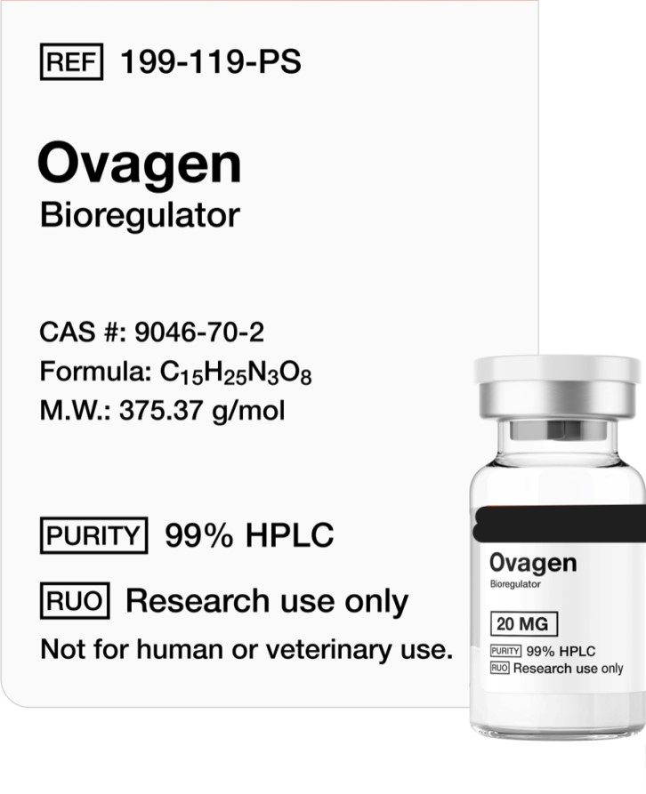 Ovagen is a short-chain peptide derived from sequences believed to be involved in ovarian tissue signaling. Bioregulator peptides are distinct from hormones in that they do not act by directly increasing or suppressing hormone production. Instead, they are thought to help normalize cellular processes within a specific organ.